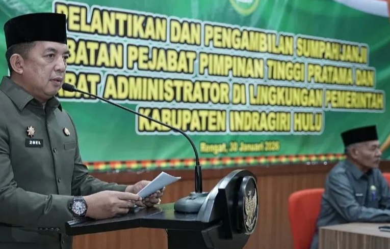 SULUHONLINE.ID (RENGAT) - Bupati Indragiri Hulu,Ade Agus Hartanto S.Sos MS.i diwakili Sekretaris Daerah (Sekda) Zulfahmi Adrian AP M.Si memimpin pelantikan dan pengambilan sumpah janji Jabatan Pimpinan Tinggi Pratama (JPTP) dan Pejabat Administrator Dilingkungan Pemerintah Kabupaten Indragiri Hulu yang berlangsung di Gedung Sejuta Sngkai Rengat, Jalan Jendral Ahmad Yani,Rengat,Jumat, 30 Januari 2026 malam